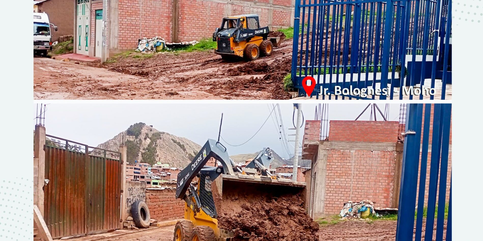 La Municipalidad Provincial de Moho, a través de la Oficina de Defensa Civil, Gestión de Riesgos y Desastres en atención a emergencia, se realiza la intervención inmediata con trabajos de limpieza de lodo y escombros provocados a consecuencia de las fuertes lluvias. Este trabajo se realiza con el fin de cuidar la transitabilidad vehicular y peatonal.