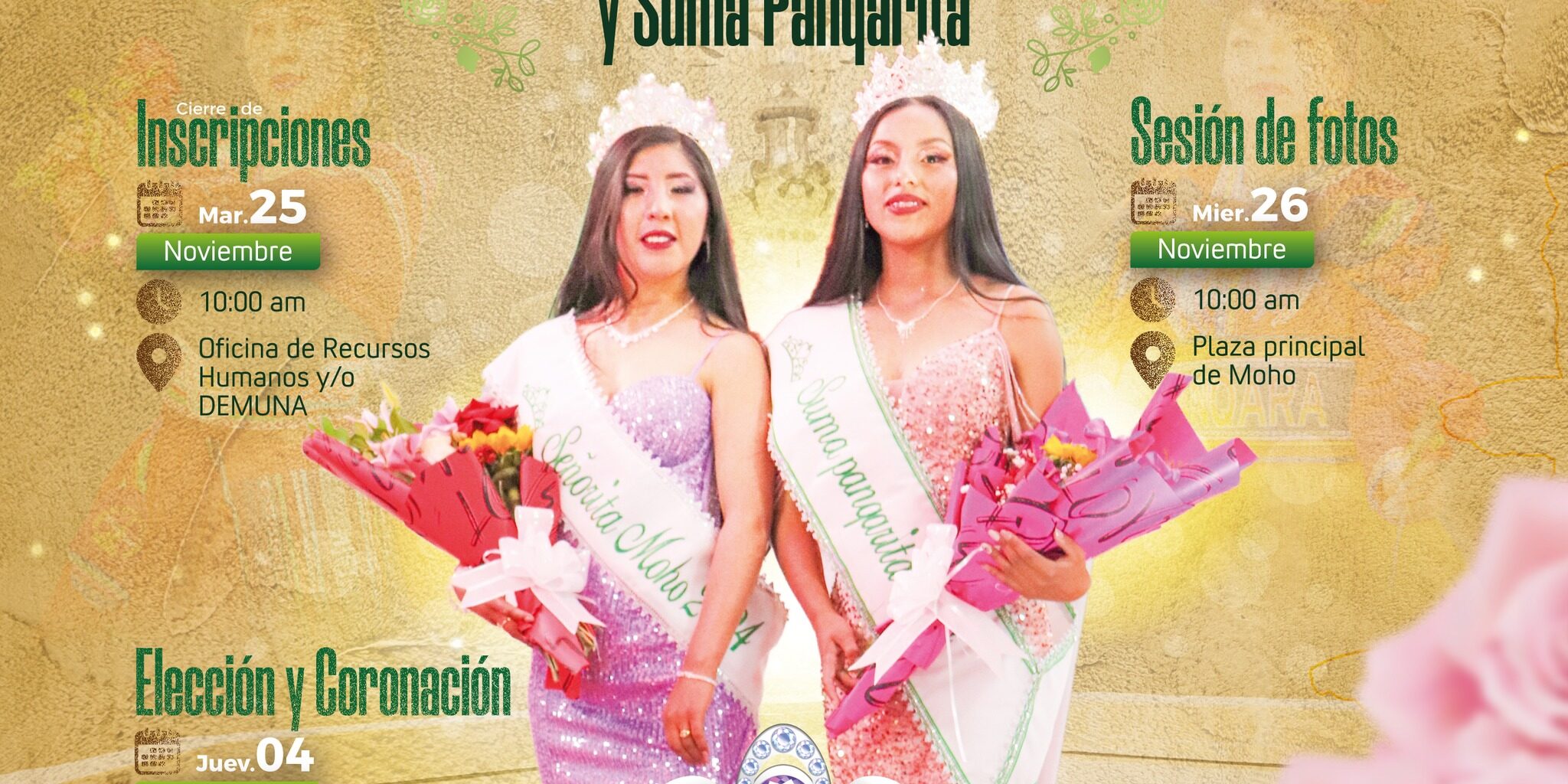 La Municipalidad Provincial de Moho, presenta a las candidatas a Señorita Moho y Suma Panqarita 2025, certamen que busca resaltar la cultura, belleza y talento de las señoritas Moheñas, actividad que se realiza como parte del programa general por los 34 años de aniversario de la Provincia de Moho. 👑