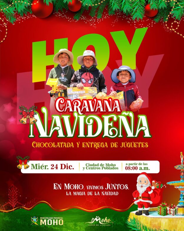 La Municipalidad Provincial Moho encabezado por el alcalde y plana de regidores, hacen extensiva la invitación a la población en general, en especial a los niños y niñas de los Centros Poblados y sectores de nuestro distrito, para la entrega de juguetes y chocolatada con motivo de las Fiestas Navideñas 2025. Fecha: miércoles 24 de…