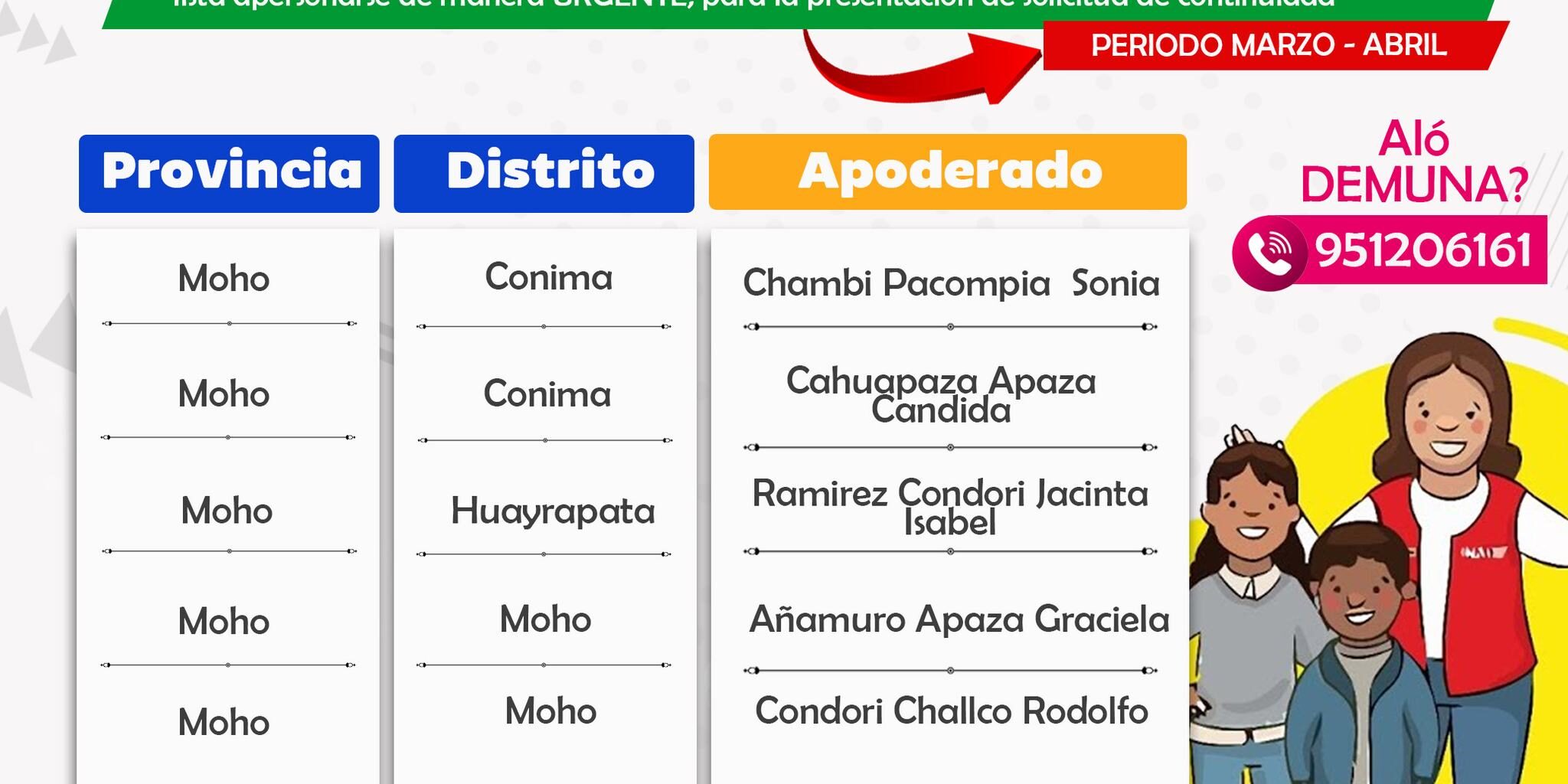 La Municipalidad Provincial de Moho, mediante la oficina de Defensoria del niño y adolescente (DEMUNA), comunica a los apoderados mencionados en la lista, apersonarse de manera URGENTE, para la presentacion de la solicitud de continuidad.