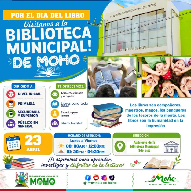 Este 23 de abril, en el marco del Día Internacional del Libro, la Municipalidad Provincial de Moho, a traves de la unidad de promocion de Educacion, Cultura y Deporte, invita a toda la población a ser parte de una jornada especial visitando nuestra Biblioteca Municipal. Abramos las puertas al conocimiento, la imaginación y la cultura.…