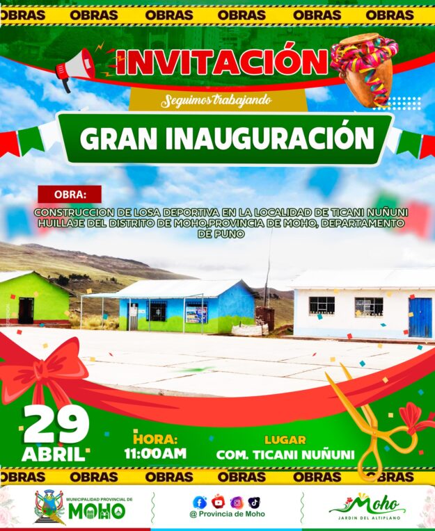 La Municipalidad Provincial de Moho, continúa inaugurando importantes obras, orientado a mejorar la calidad de vida de nuestros hermanos y hermanas moheñas De esta manera, invitamos a toda la población a participar en la Gran Inauguracion de: CONSTRUCCION DE LOSA DEPORTIVA EN LA LOCALIDAD DE TICANI NUÑUNI, HUILLAJE DEL DISTRITO DE MOHO, PROVINCIA DE MOHO,DEPARTAMENTO…